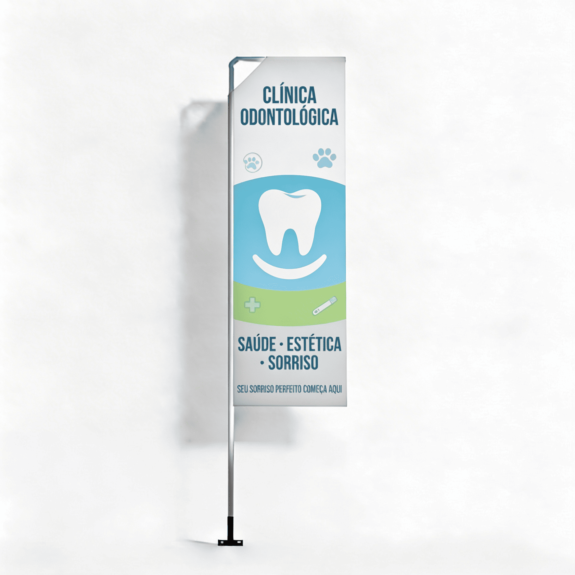Wind Banner Full de parede, formato retangular, com suporte de parede. Ideal para destacar sua marca em ambientes internos ou externos, oferecendo visibilidade e impacto visual de forma prática e resistente.