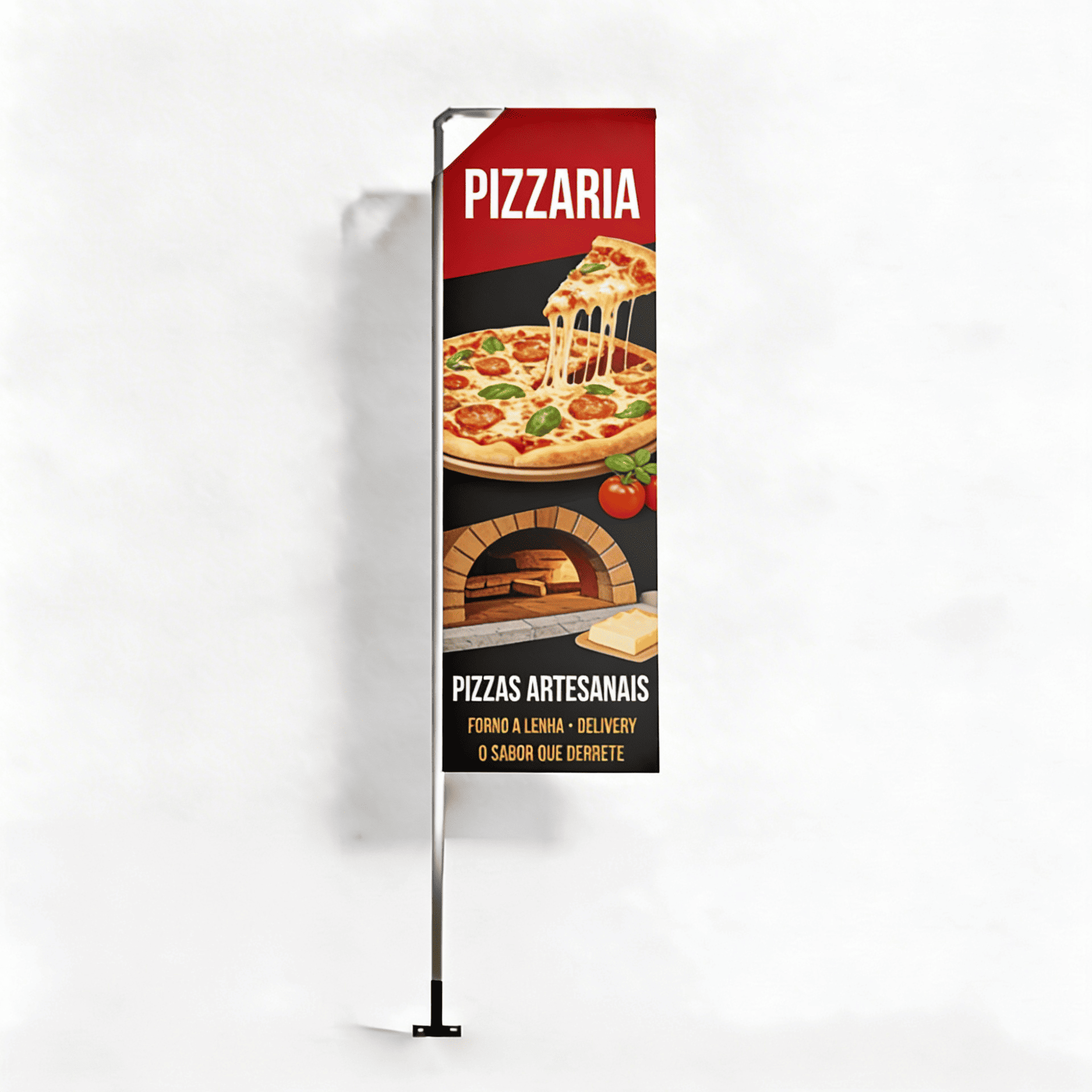 Wind Banner Full de parede, formato retangular, com suporte de parede. Ideal para destacar sua marca em ambientes internos ou externos, oferecendo visibilidade e impacto visual de forma prática e resistente.