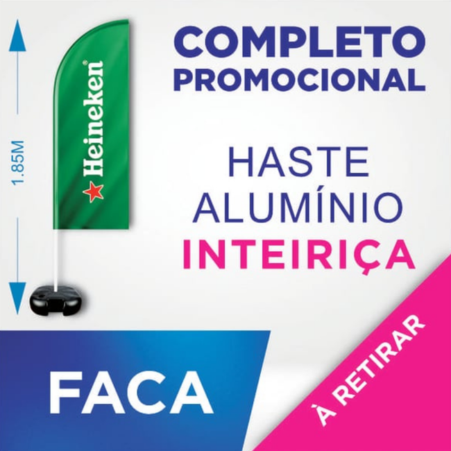 Wind Banner promocional com 1,85m de altura, haste inteiriça e tecido com costura externa, garantindo maior resistência e durabilidade. Ideal para eventos ao ar livre, feiras e promoções, oferece visibilidade e impacto visual para destacar sua marca c